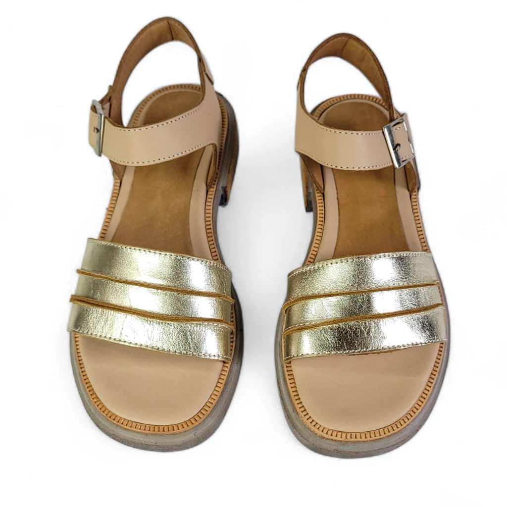 Diseño fresco y moderno. La Ava combina el brillo del cuero metalizado con la suavidad del cuero natural, logrando un equilibrio perfecto entre estilo y comodidad. Su base liviana con suela de goma y el cierre con hebilla aseguran una pisada firme y confortable, ideal para todos los días del verano.